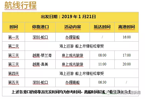 据悉,歌诗达威尼斯号邮轮1月21日16时从蛇口邮轮母港出发,为6天5晚的航程,航行路线为:深圳-下龙湾(蔡兰港)-岘港(真美)-深圳。