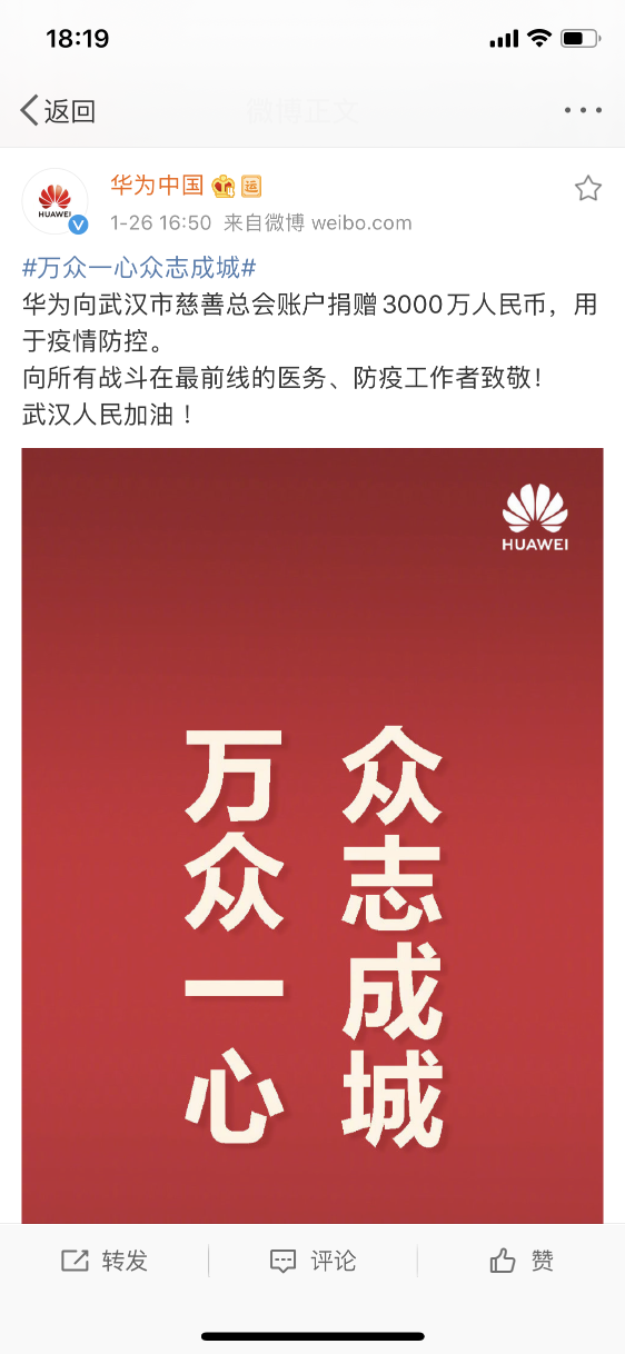 华为表示:“向所有战斗在最前线的医务、防疫工作者致敬!武汉人民加油!”