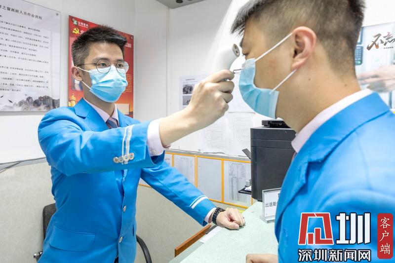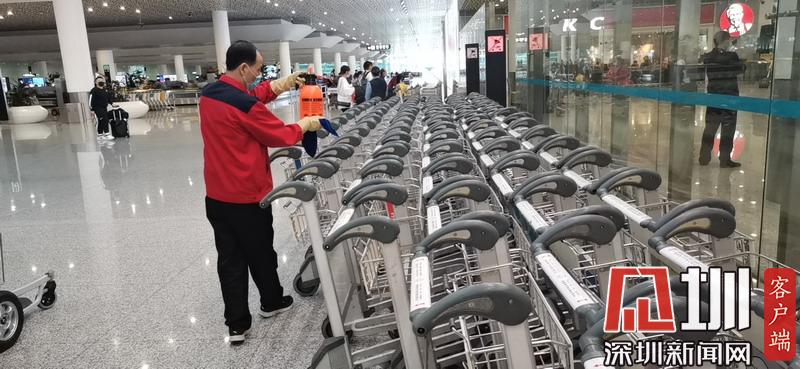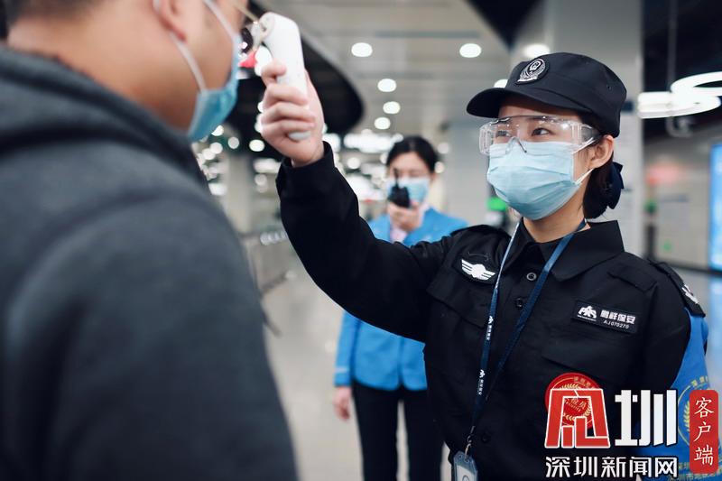 在深圳机场,工作人员对往来乘客进行体温检测。