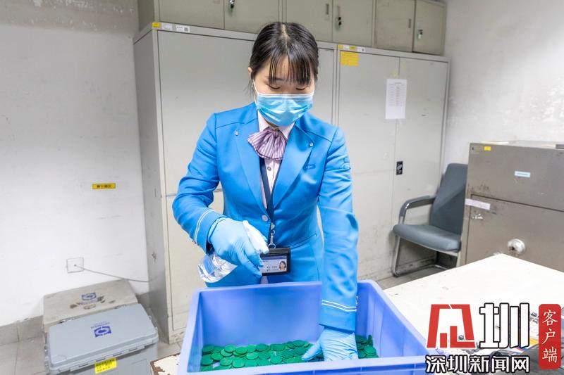 深圳地铁车站工作人员对地铁票卡进行消毒。