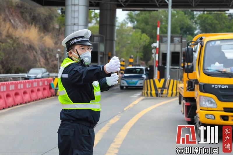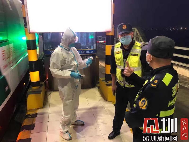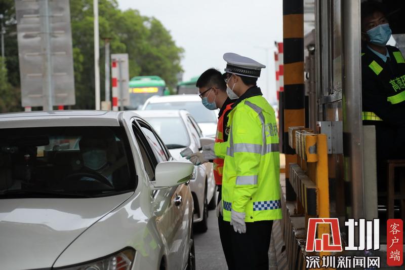 26日下午深圳黄鹤收费站,深圳交警对往来司机进行体温检测。