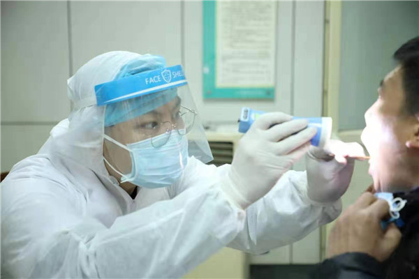 消化内科苑仁杰医生第一时间请缨到发诊门诊上班,这是他正在为发热病人诊治