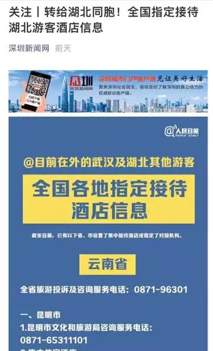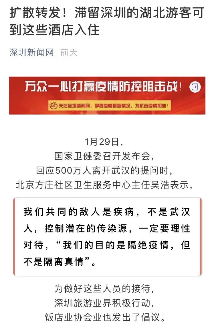 日前深圳就公布了一批指定接待湖北游客的酒店信息,深圳旅游业界积极行动,饭店协会业也发出倡议:疫区游客是我们的同胞,不仅不能歧视,要伸出援手帮助他们!