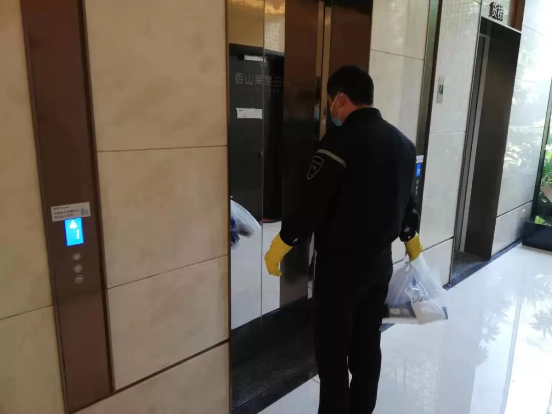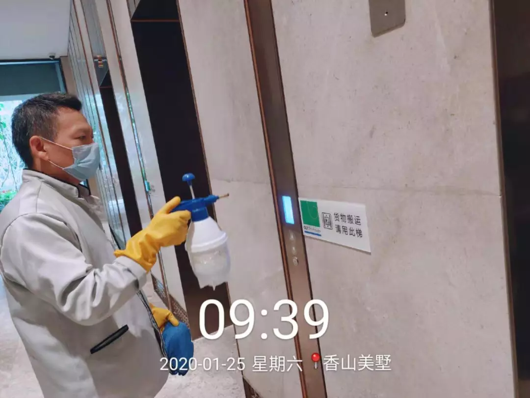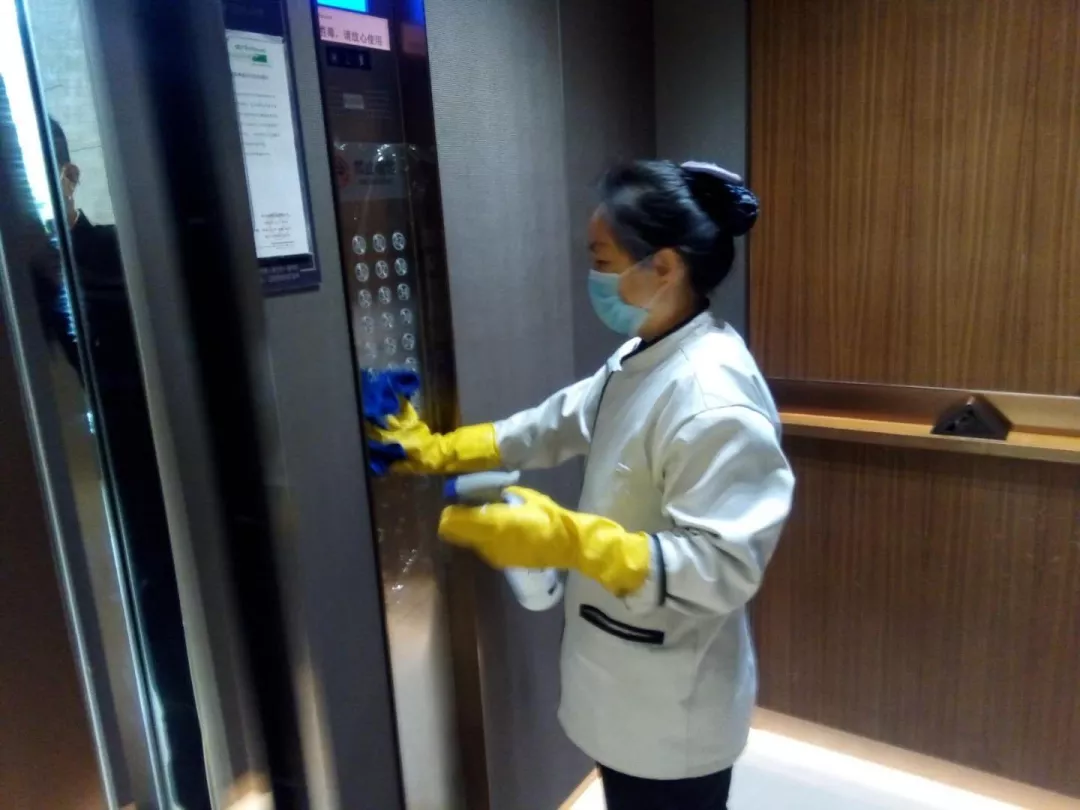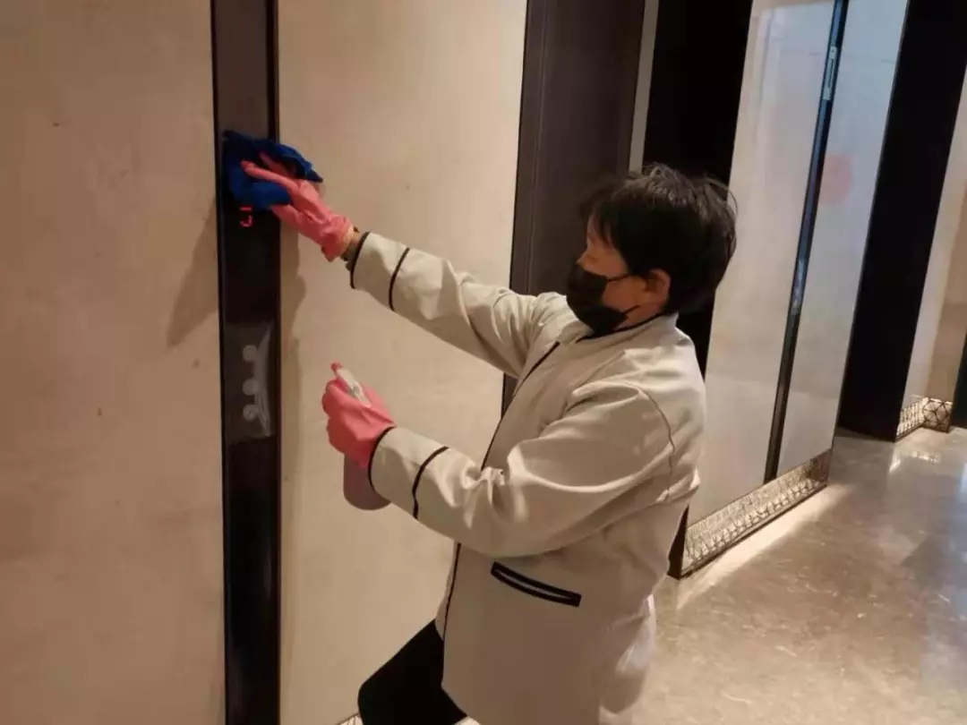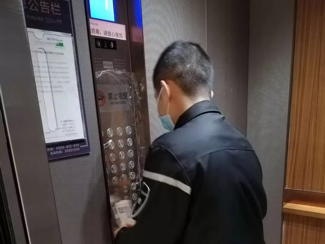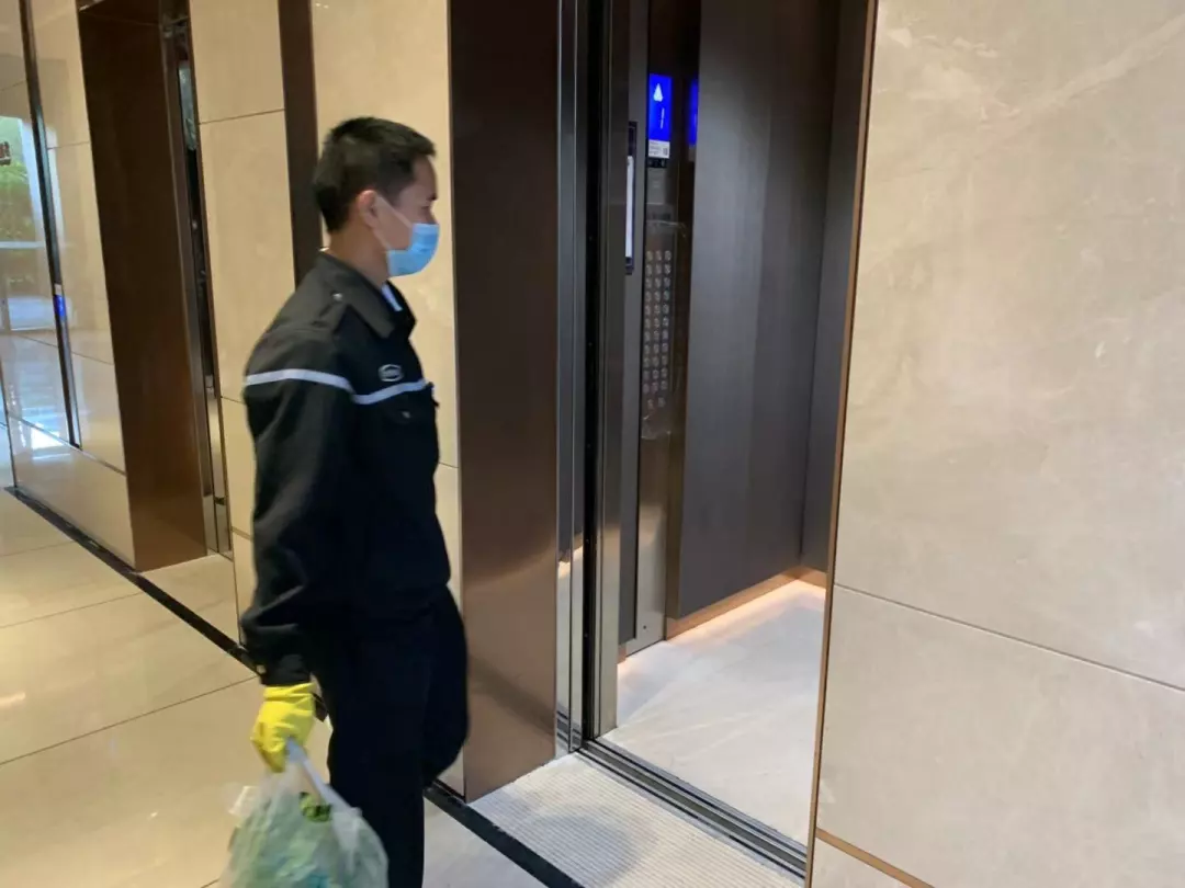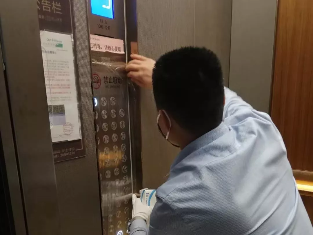 每天对小区公共区域大堂门把手、门禁对讲机、电梯按键、大堂茶几沙发等高频接触区进行消毒及对轿厢按钮定时更换保鲜贴膜。