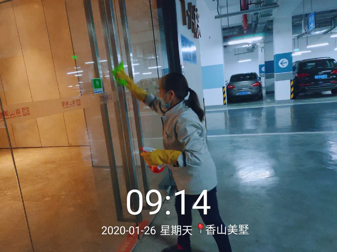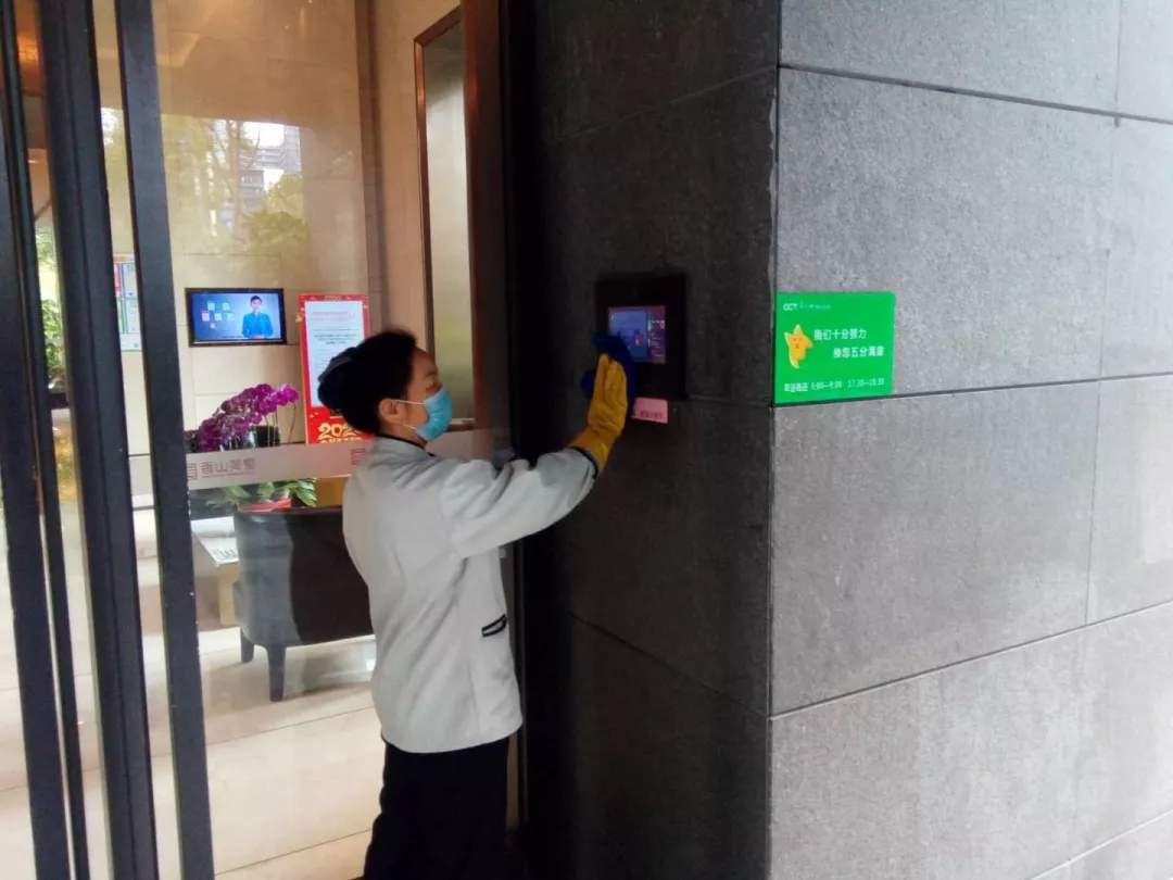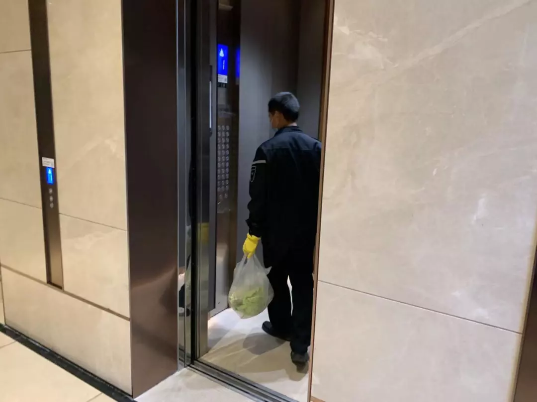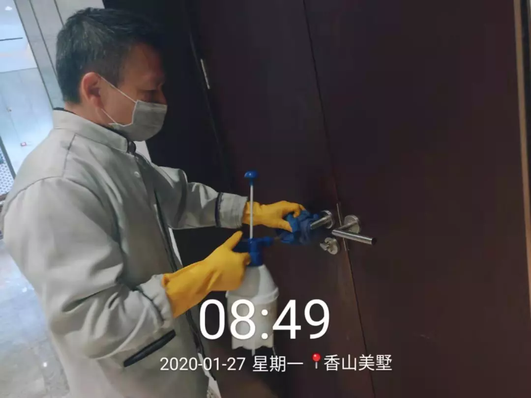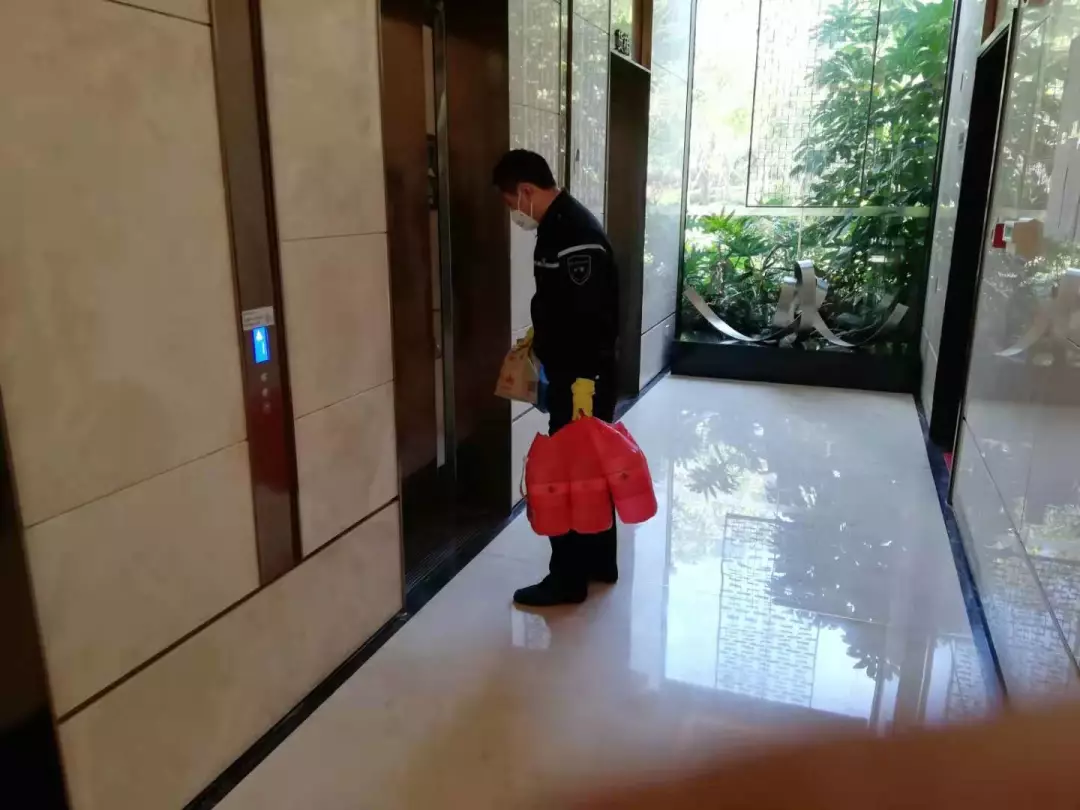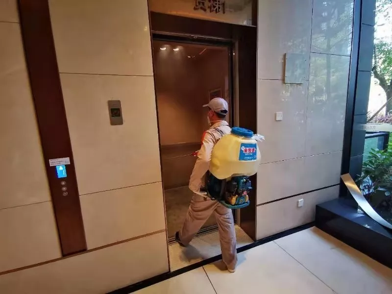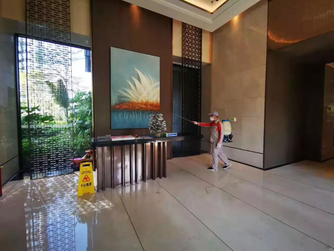 每天对小区公共区域大堂门把手、门禁对讲机、电梯按键、大堂茶几沙发等高频接触区进行消毒及对轿厢按钮定时更换保鲜贴膜。