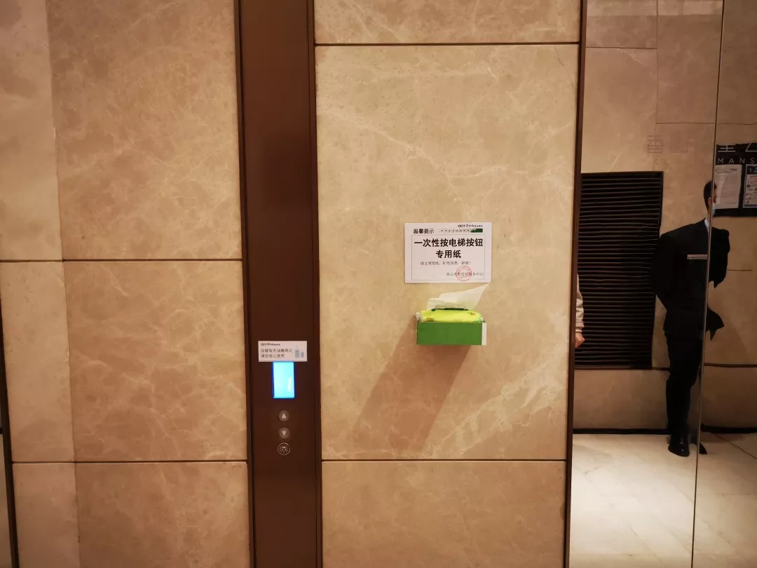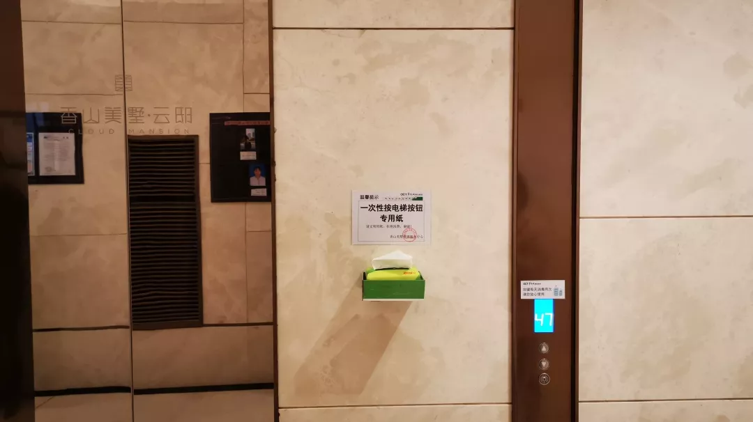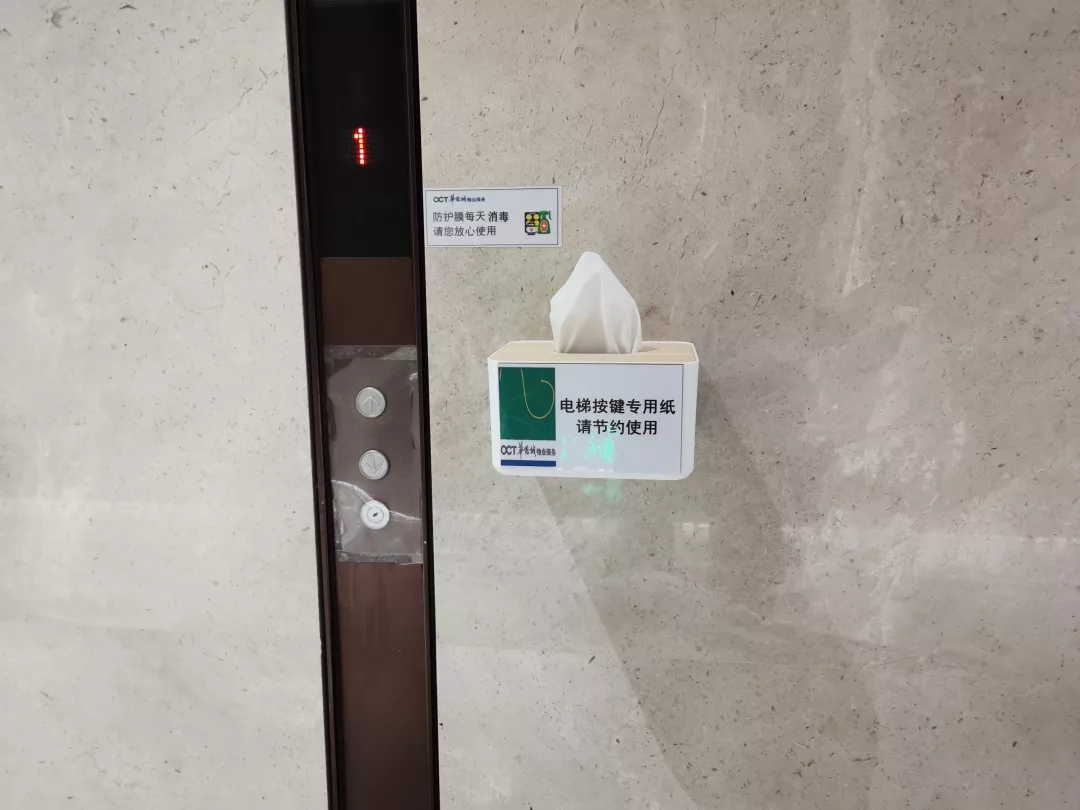 考虑到防控形势需要,中心对电梯间及按钮每天至少不低于2次消毒、且每天更换保鲜贴膜外,又于31日在各个电梯厅增设了一次性抽纸,供乘坐电梯按电梯按钮时取用。(注:部分楼栋、明天陆续增设到位)