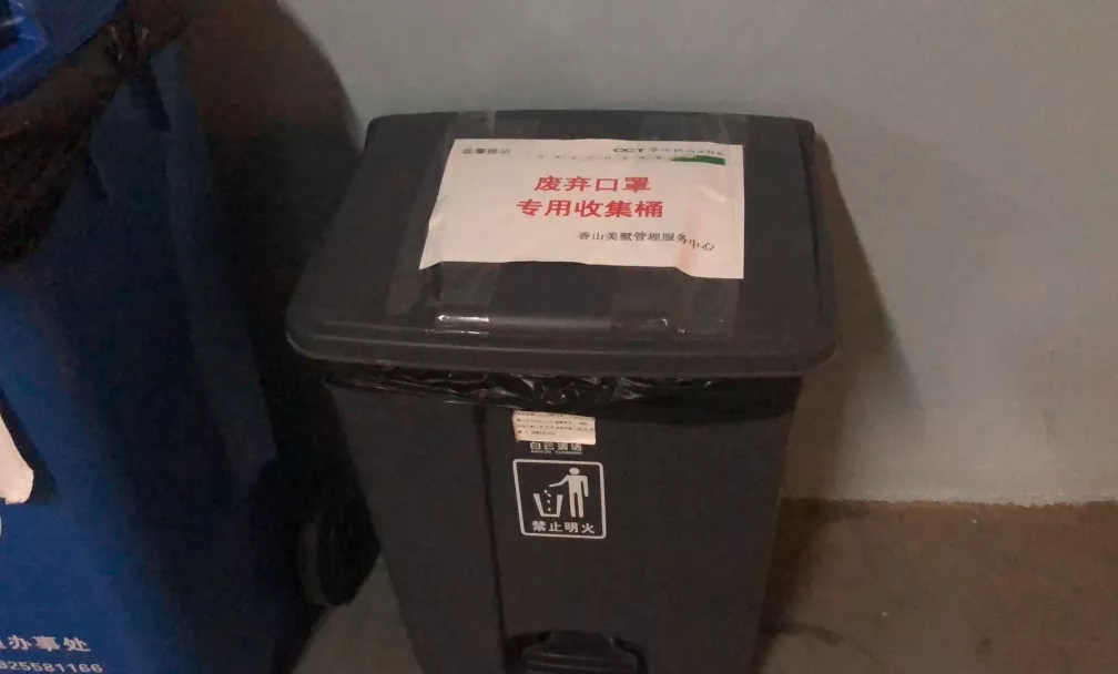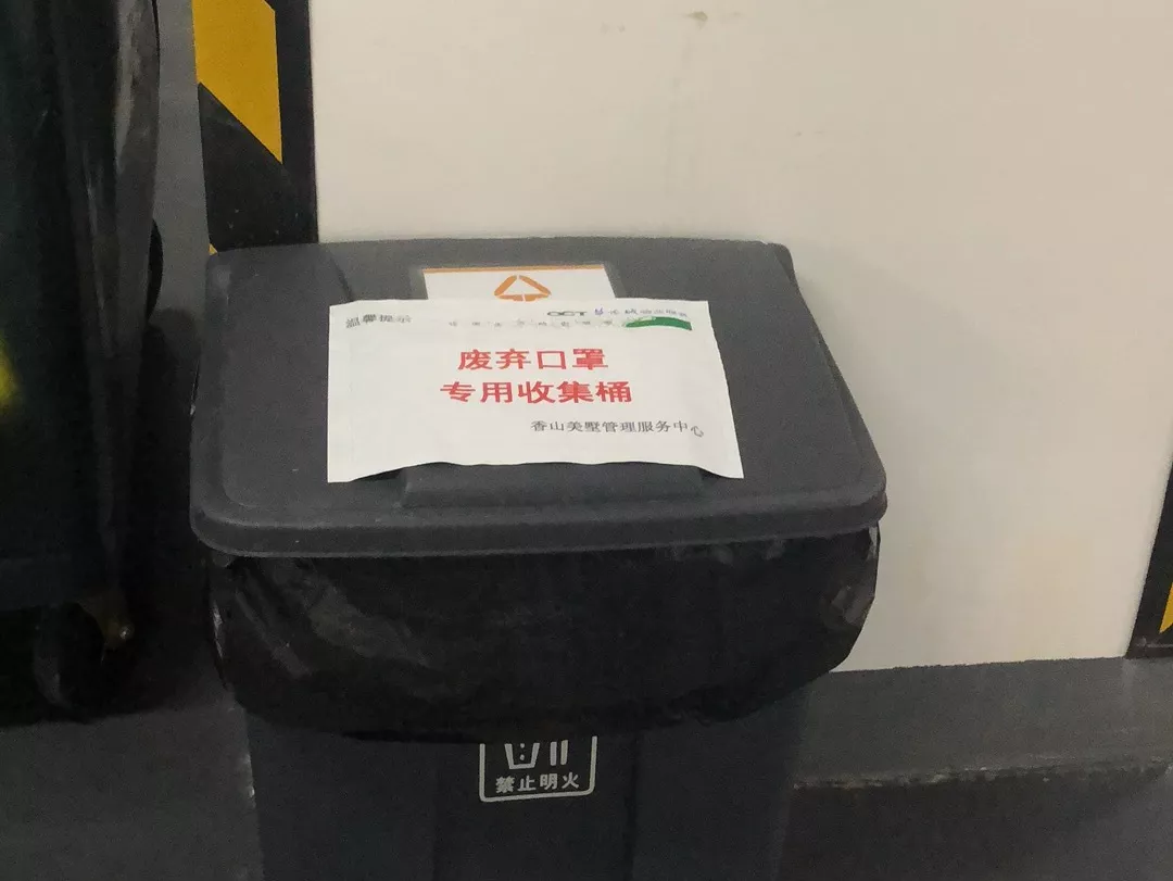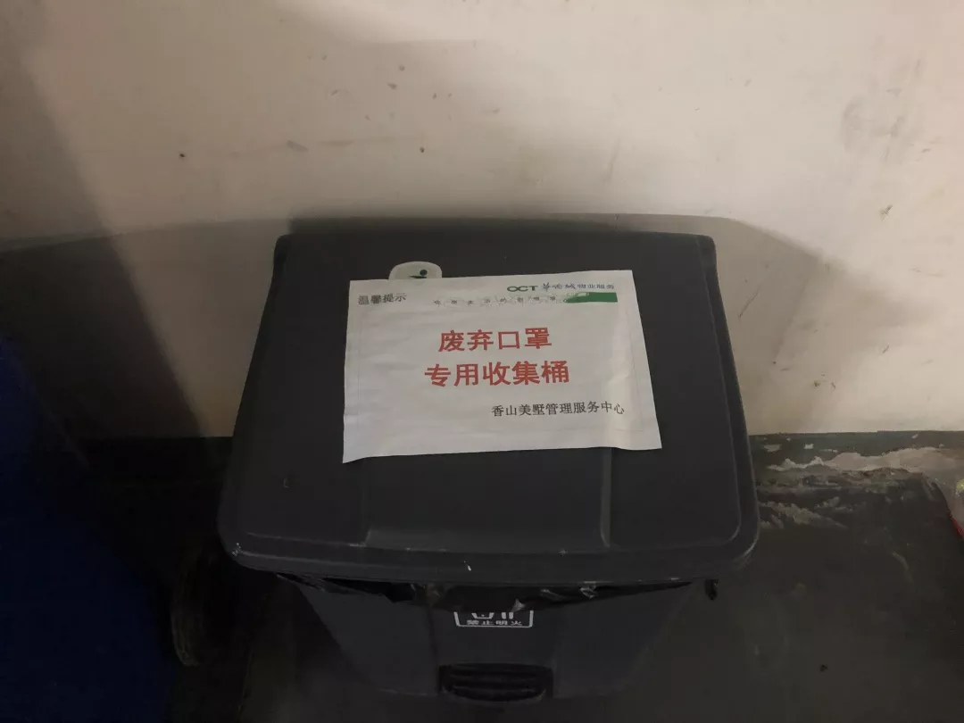 为防止废弃口罩造成二次污染,管理服务中心在每栋楼宇垃圾集中收集点处,增设了“废弃口罩专用收集桶”规范处理废弃口罩;并要求工作人员每天对收集桶消毒加强防护。