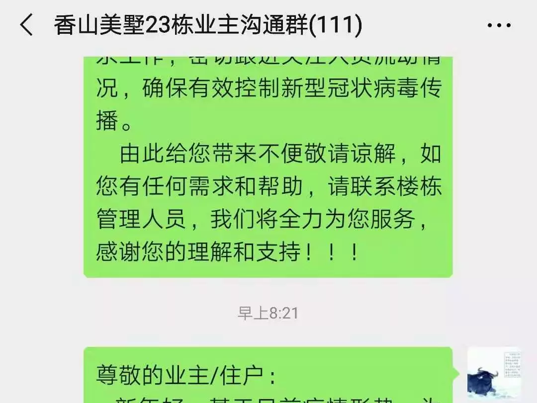 基于疫情形势,小区探亲访友、外卖、快递等人员暂时不允许进入小区,避免交叉感染。外卖暂由我们物业值班人员进行配送。