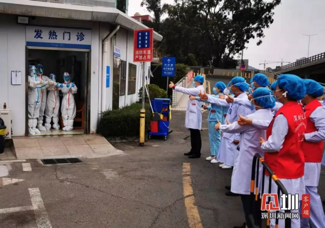 大年初一早上九点,深圳市第二人民医院发热门诊门口,院长正在带队慰问在发热门诊一线“战疫”的工作人员,因为处于敏感病区,发热门诊的工作人员只能这样全幅武装地表达决心。