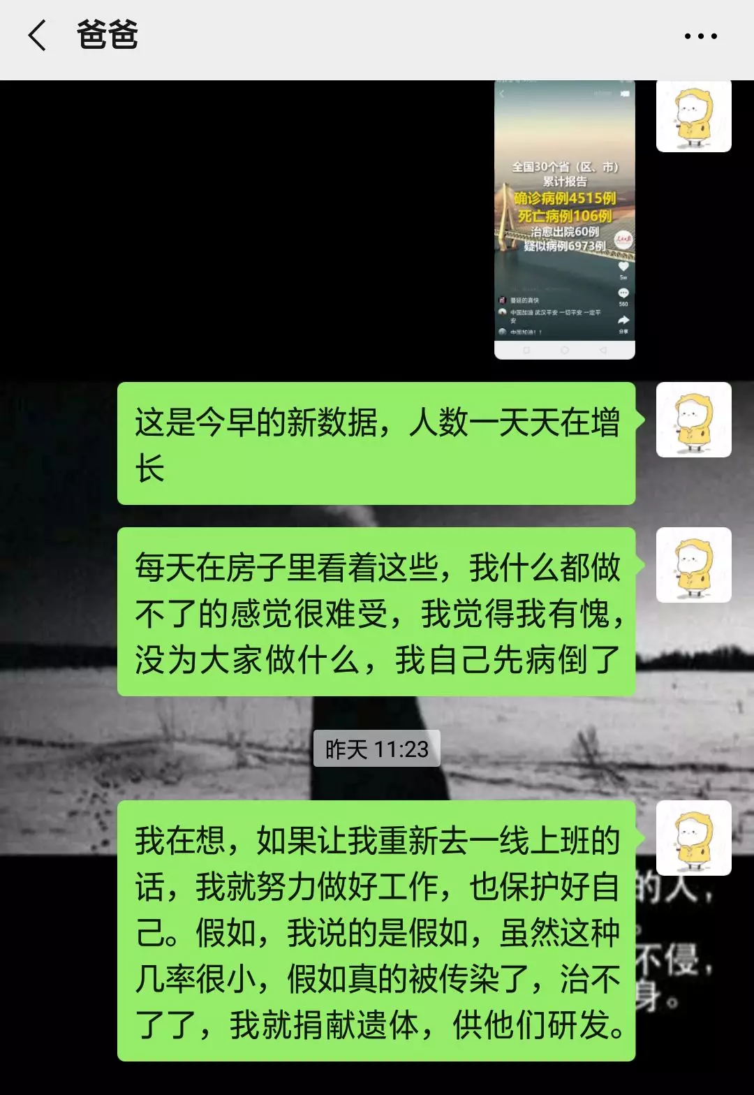 高强度的密闭性工作,李生兰病倒了,病床上她依然数次“请战”。在发给爸爸的微信中,她写道,“假如我倒在了岗位上,请捐献我的遗体!”把我的遗体捐献,我希望能为这次疫情做点什么!