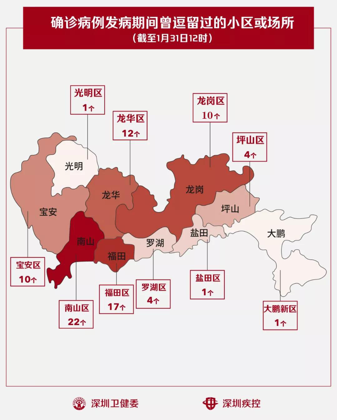 截至1月31日12时,深圳累计确诊的134个“新型肺炎”患者,曾在出现病征期间逗留过以下82个场所,其中有部分地方同时出现了多个病人(主要是一个家庭内有多人发病)。