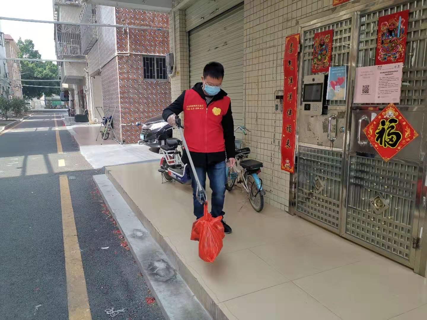 社区党委副书记黄幼专同志带头为居民隔离人员消毒垃圾并处理垃圾