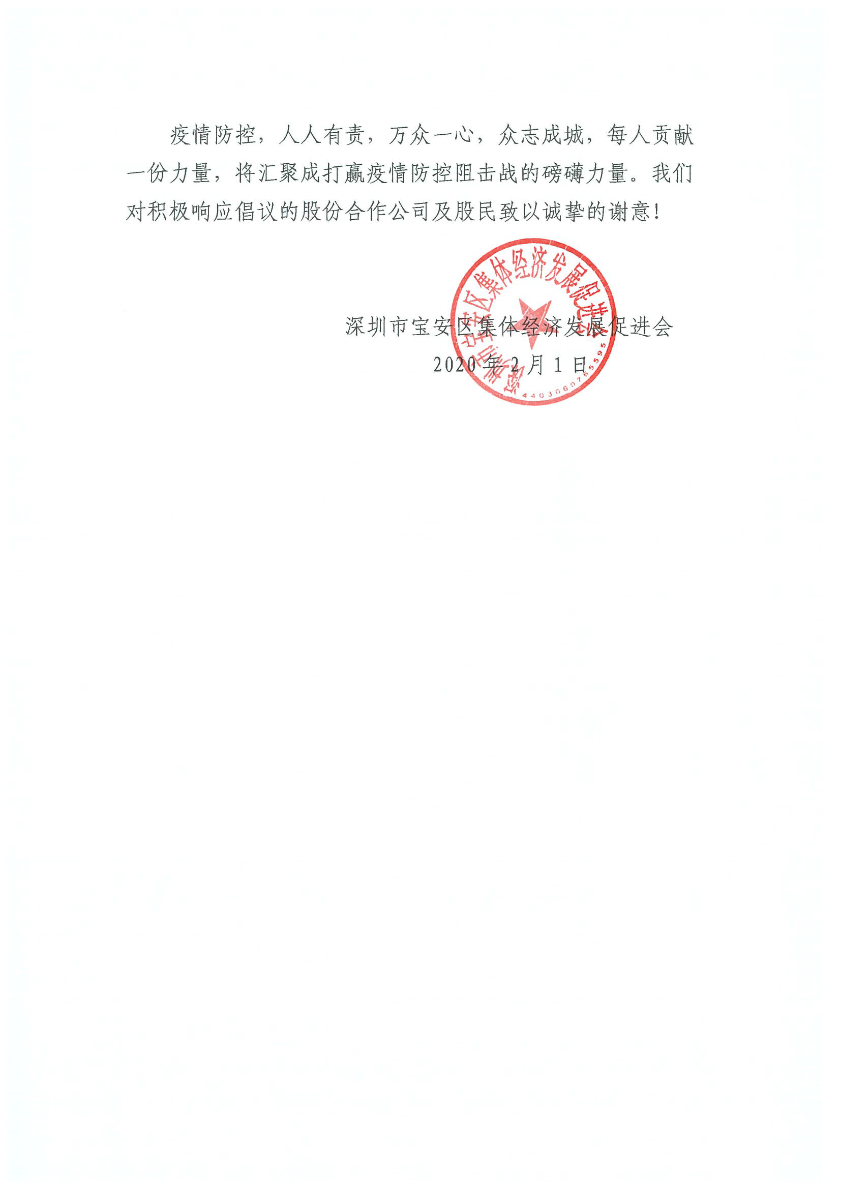 深圳新闻网宝安讯 “疫情防控,人人有责,万众一心,众志成城,每人贡献一份力量,将汇聚成打赢疫情防控阻击战的磅礴力量。”2月1日晚,宝安区集体资产管理局指导宝安区集体经济发展促进会向宝安区各社区股份合作公司、全体股份合作公司股民发出《同心协力共克时艰适当减免企业及来深务工人员租金的倡议书》,号召全区股份合作公司及股民适当减免企业及来深务工人员15-30天租金及物业费,并根据疫情防控的需要可再次追加减免。