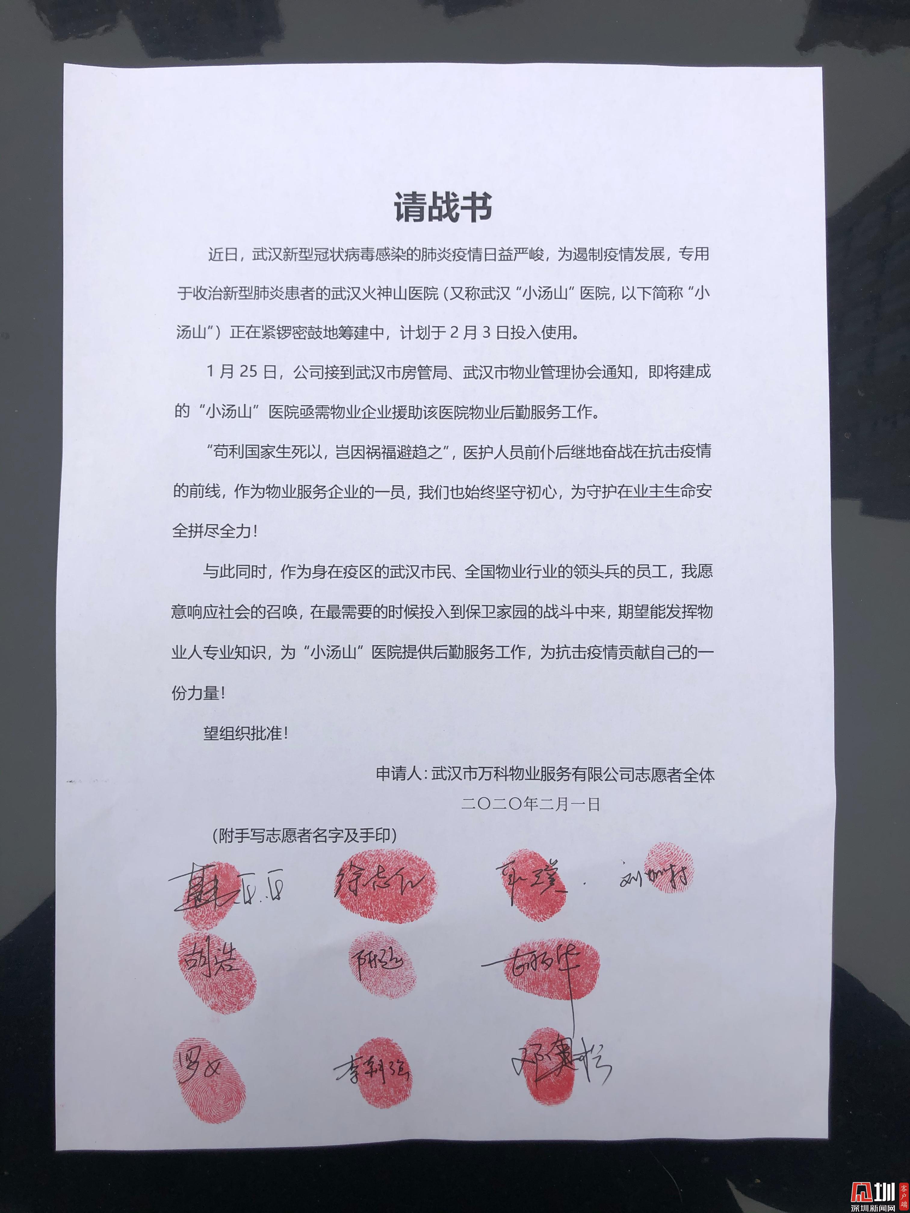 担任万科物业志愿者团队队长的韩乐乐说:“此次前去火神山支援的第一批志愿者10个人里,我熟悉的有4人,都是部队退伍的,党员也有2个。有小区项目的物业服务人员、案场售楼中心的物业服务人员,也有来自商写服务线条的物业服务人员。大家积极性都很高,希望能为疫情防疫尽绵薄之力。”
