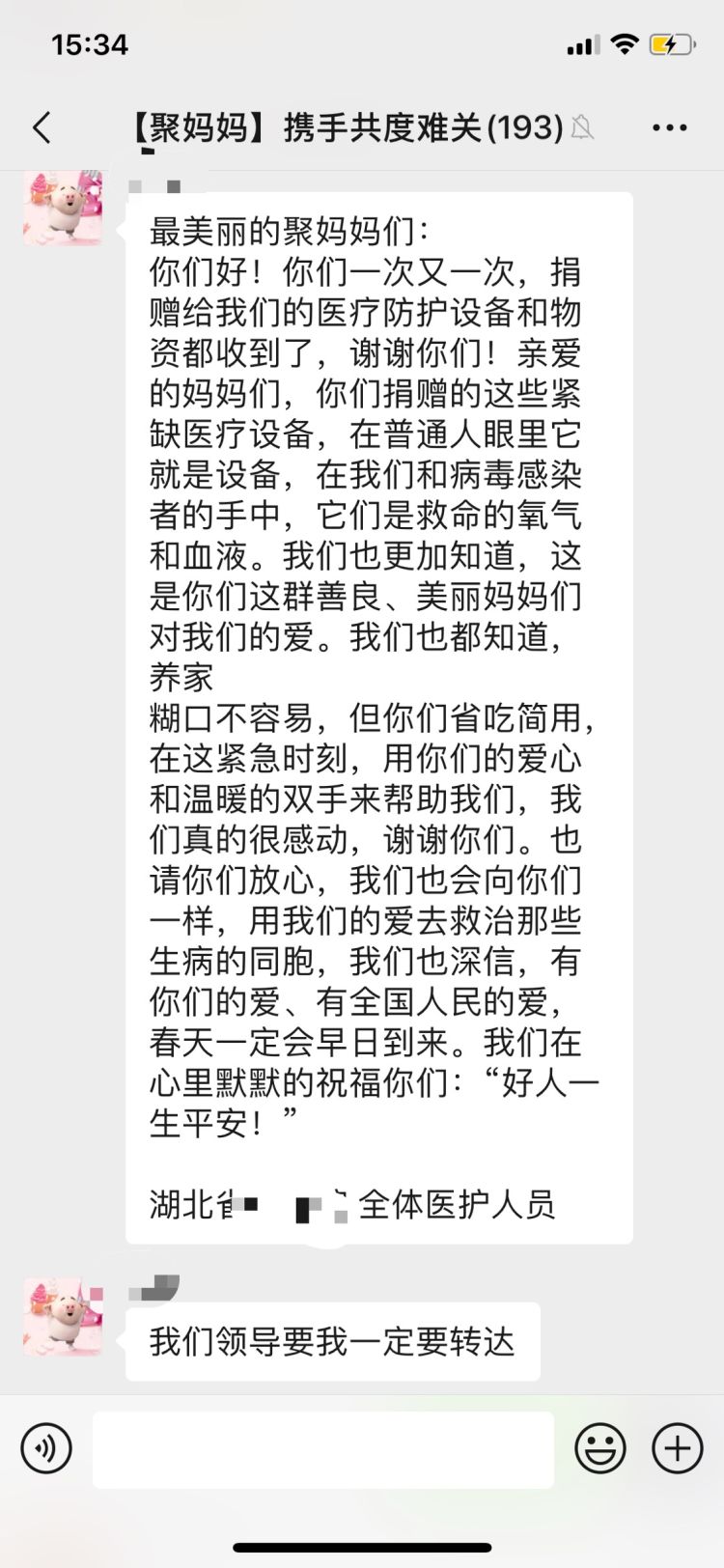 这一百多名妈妈是一个名为“聚妈妈携手共渡难关”(以下简称“聚妈妈”)微信群的成员,Miya是“聚妈妈”的发起人之一。1月24日除夕那天,Miya与一位朋友聊起疫情,两人都觉得,医院缺物资,一两人的力量又太单薄,不如发动朋友们一起购买直接送到医院。Miya在当晚9点左右建了这个临时群,并邀请周围熟识的朋友加入。