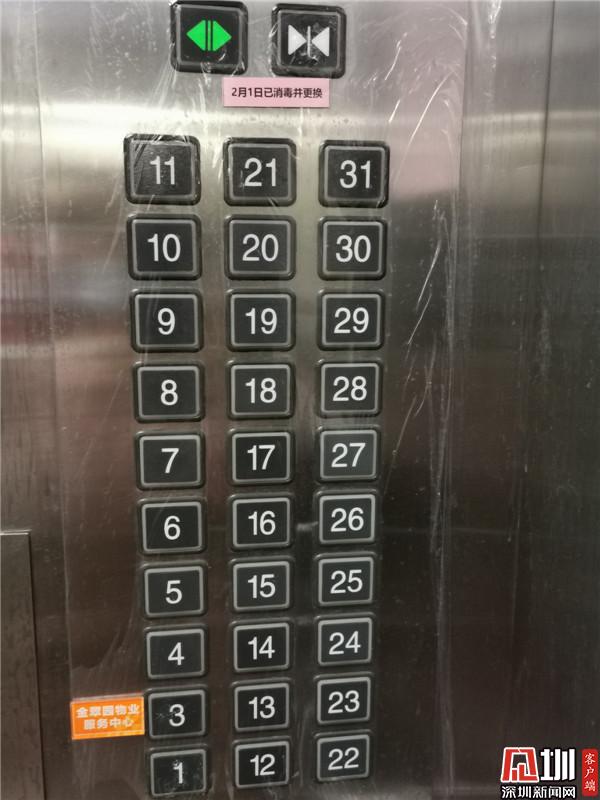 电梯摁键贴上了保鲜膜并注明当天已消毒。