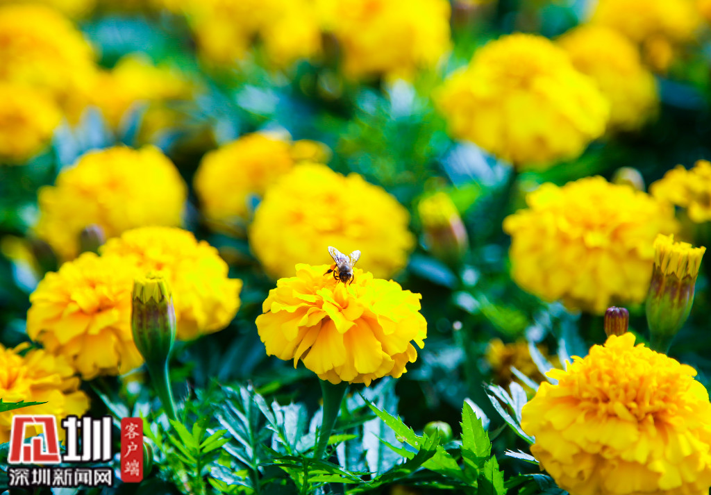 百花争艳的莲花山公园,惹来了忙着采蜜的蜜蜂。