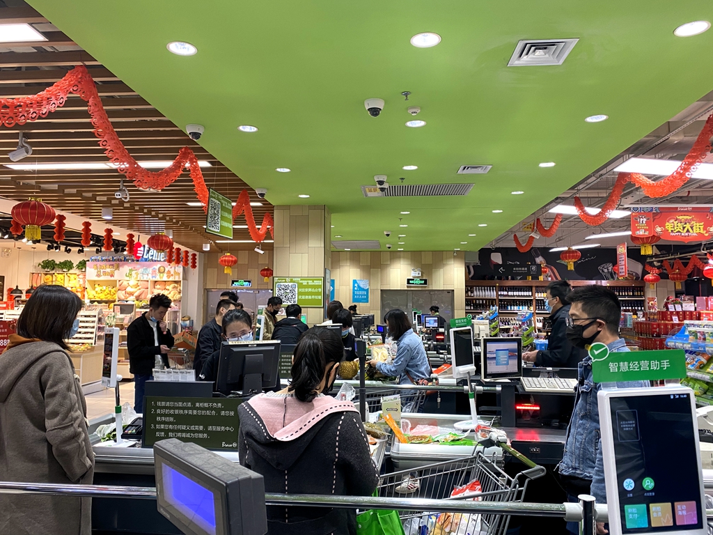 与寂寥的街道相映成趣的是商场内排队购买果蔬的市民