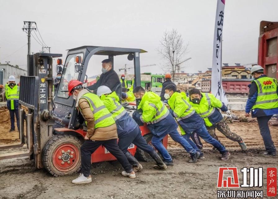 恰逢雨天,道路泥泞。运送重型设备的叉车陷入呢泥潭,众人协力推车。(迈瑞医疗供图)