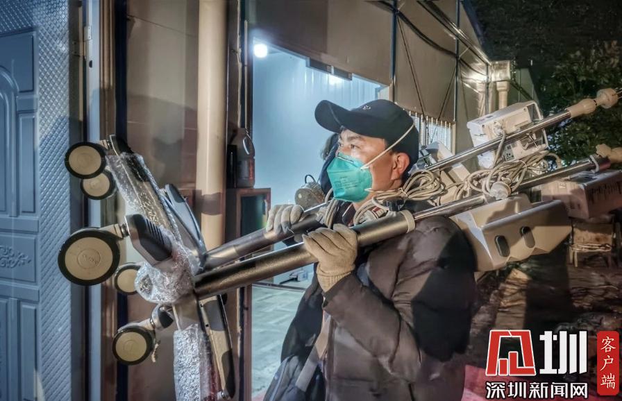 2月2日,工作人员将迈瑞设备扛进火神山医院储藏室。(迈瑞医疗供图)