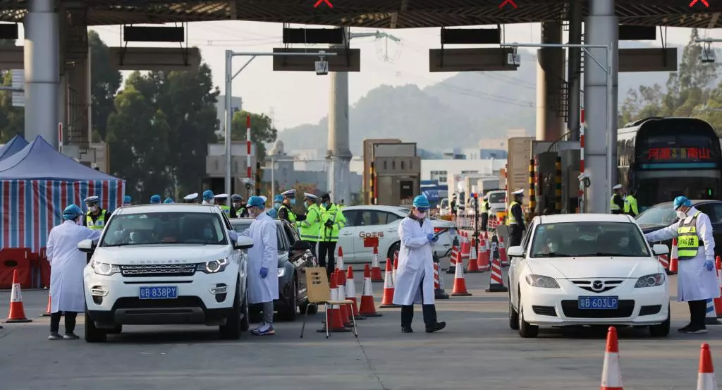 执勤民警、医务人员忙碌而有序地进行体温检查。