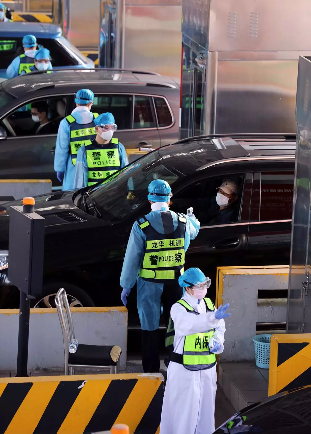 执勤民警协助医务人员对入深车辆上的人员进行体温检测。