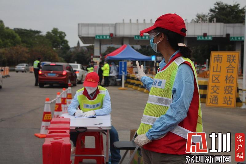见圳客户端·深圳新闻网2020年2月3日讯(见圳客户端、深圳新闻网记者吴梓欣)眼下正值返深高峰期,为控制疫情影响,近日,深圳交通运输局在城市出入要道都设置了检疫区。“打开车窗,带好口罩,测量体温……”2月2日,记者在南头收费站看到交警正为过往车辆及人员测量体温,在身着“南山交通”黄马甲的交通检查队伍中还有一抹熟悉的红色——深圳义工。