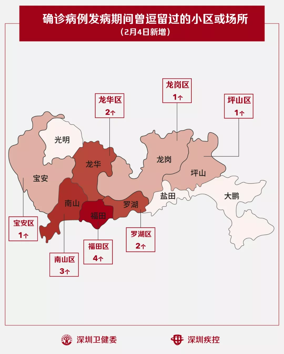 2月4日,疾控专业人员通过最新的流行病学调查确认,深圳新增14个小区(场所),有新确诊的病人在出现病征期间曾经逗留。