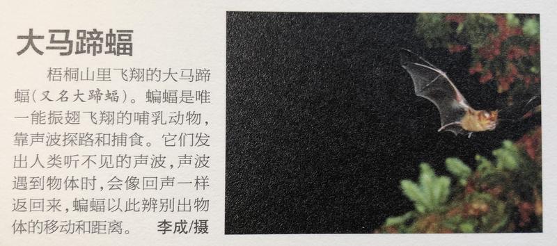 “我是在梧桐山附近仙湖植物园拍到的大马蹄蝠。每到傍晚,仙湖植物园进出园区的那条路上,都有数量比较多的大马蹄蝠在那飞。当时有几棵树在开花,我拍了好几张终于抓拍到一张清晰的。”2月4日,李成在回忆当年拍摄经历时说,当时蝙蝠群距离他最近的有2-3米,最远的有10多米。
