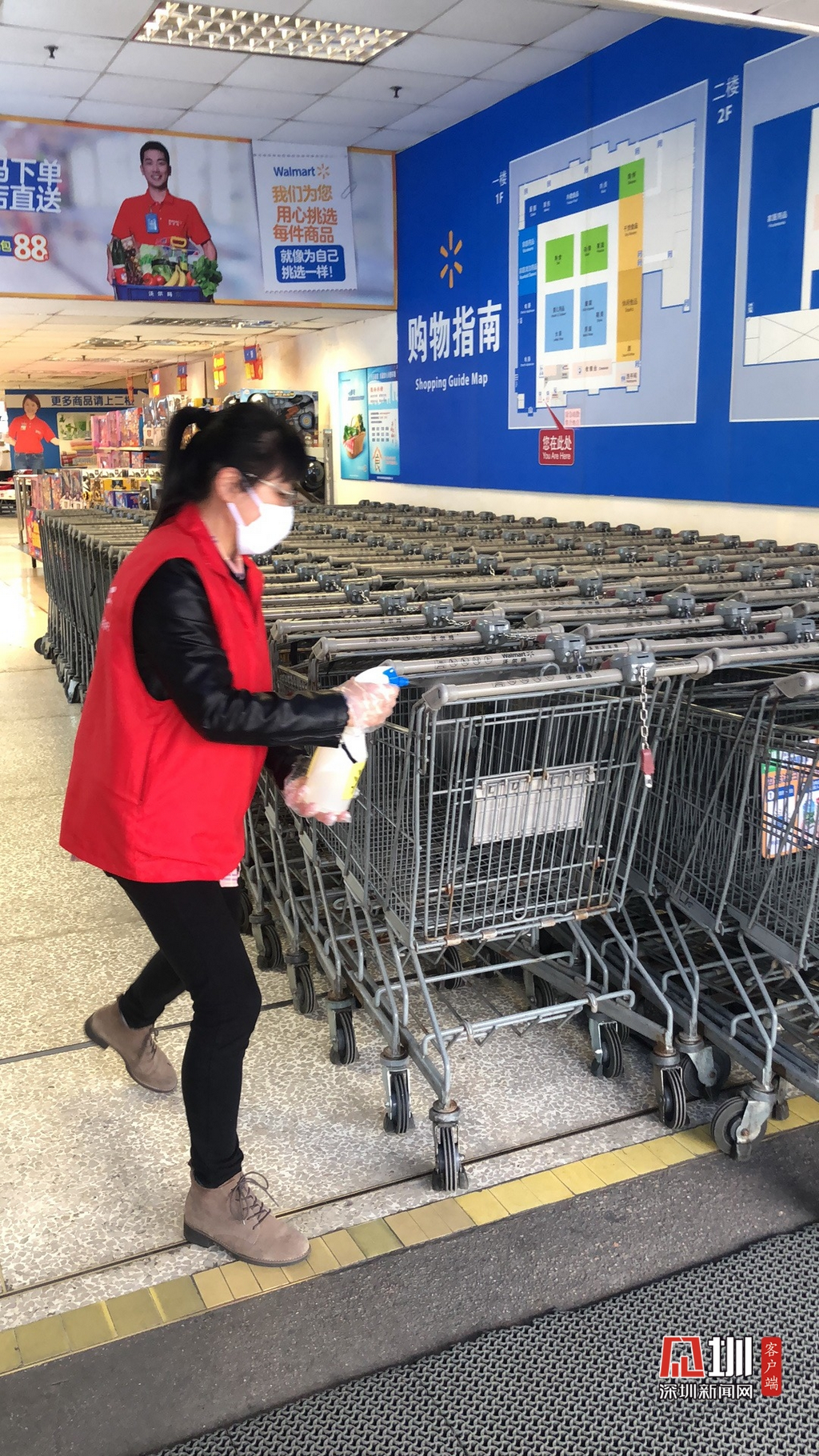 在消毒方面,景田北沃尔玛超市每天对超市进行高频次消毒,包括购物车、按键、门把手、出入口等人群经常接触的区域,并保持场所通风,增加空气对流。