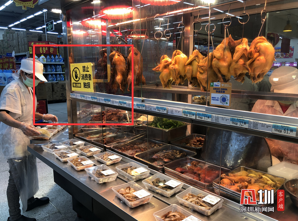 《公告》中提到,禁止商场、超市、糕点店、水果店提供食品“试吃”服务。记者看到,景田北沃尔玛超市熟食区有明显禁止消费者触摸等标志。“疫情防控期间,我们是禁止给市民提供试吃的。”沃尔玛相关负责人说道。