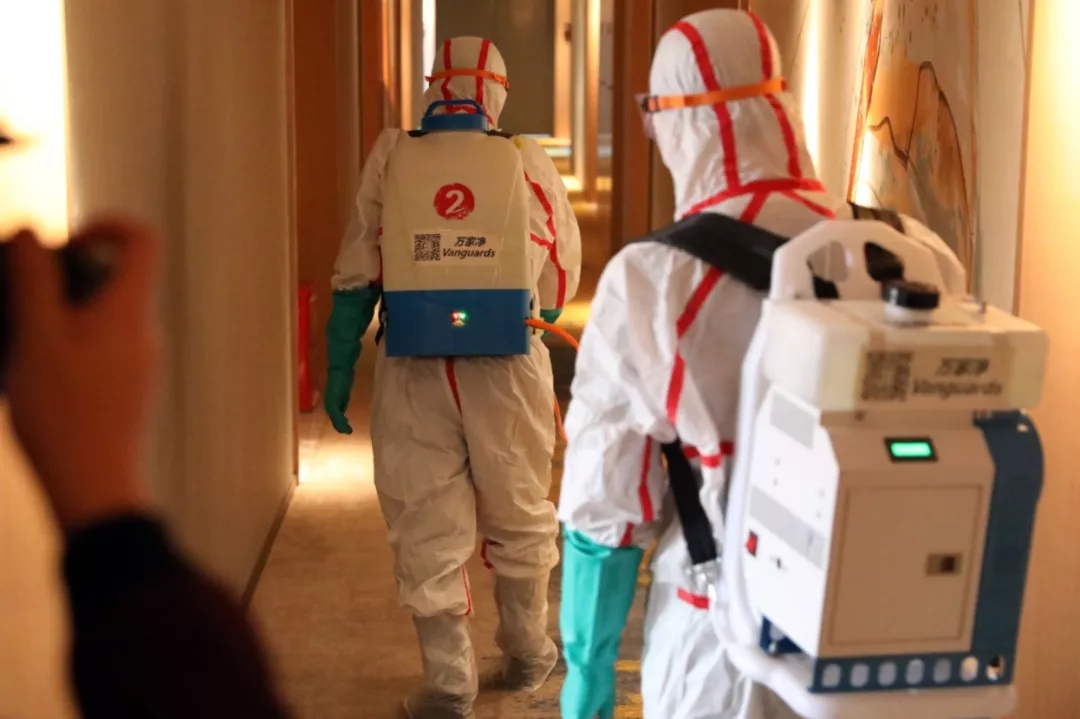 ▲疾控人员对病人逗留过的场所进行终末消毒
