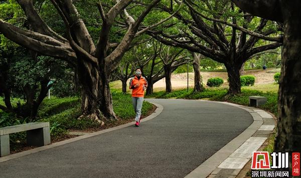 灵芝公园:有市民戴着口罩仍坚持跑步。