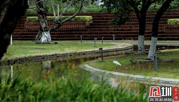 海滨广场:白鹭栖息在略显空旷的草地上。