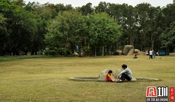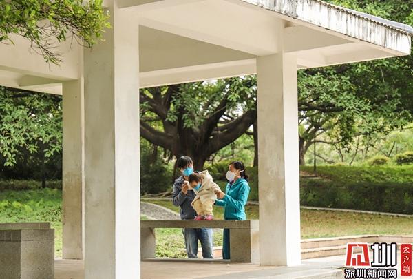 灵芝公园:一对夫妻戴着口罩来公园遛娃。