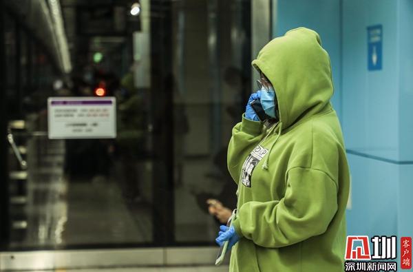 地铁:地铁上一位市民“全副武装”,不仅戴上了口罩,双手也戴上了手套。