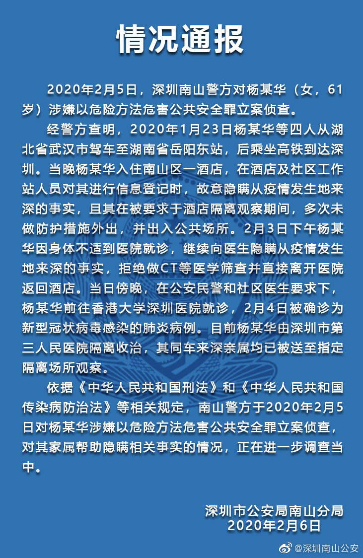 依据《中华人民共和国刑法》和《中华人民共和国传染病防治法》等相关规定,南山警方于2020年2月5日对杨某华涉嫌以危险方法危害公共安全罪立案侦查,对其家属帮助隐瞒相关事实的情况,正在进一步调查中。
