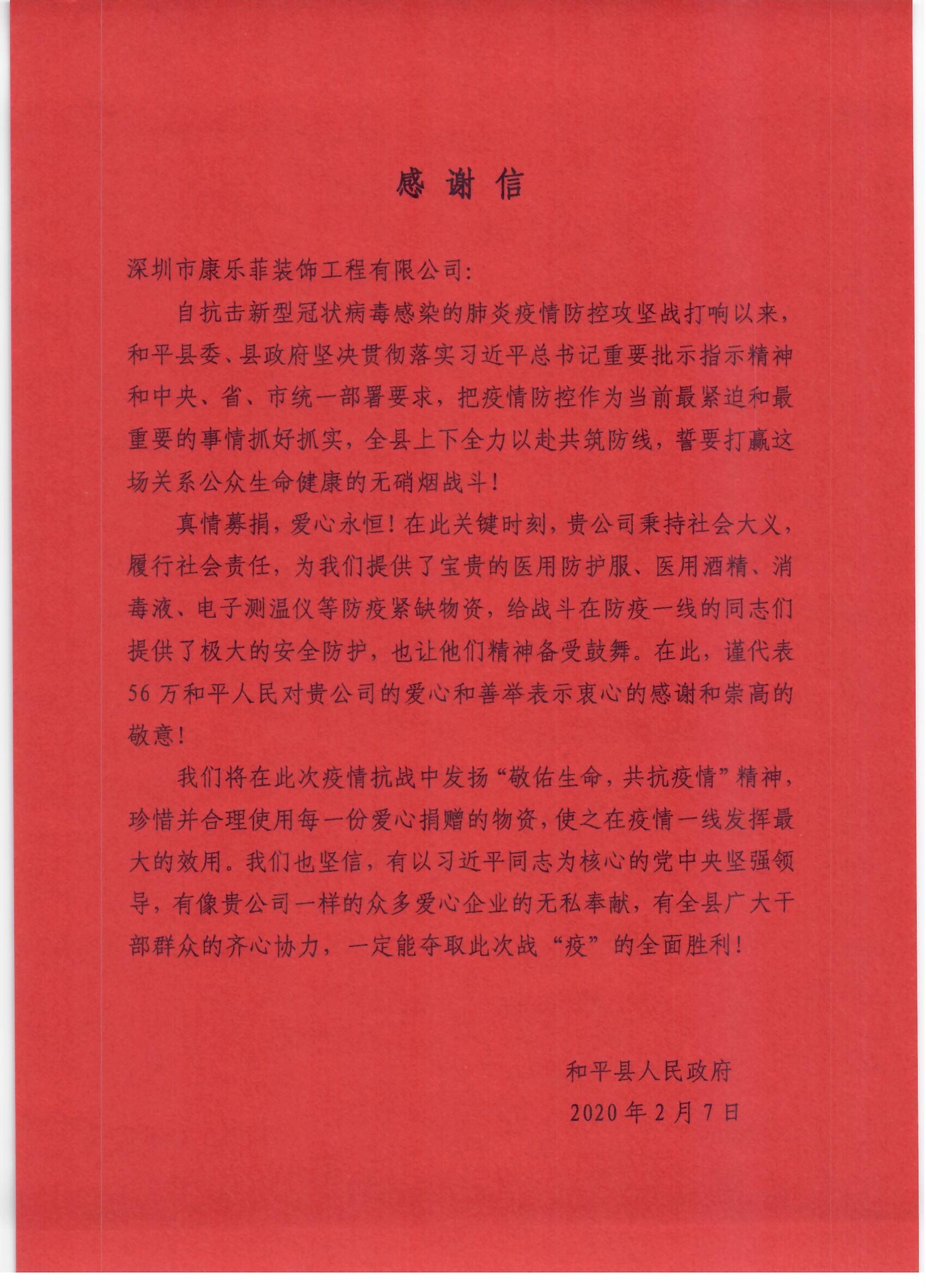 自疫情发生以来,福田区全区上下全面深入贯彻落实“四个一”应急处置机制,时刻把人民群众生命安全和身体健康放在第一位,在全力做好辖区疫情防控的同时,仍心系和平县群众安危。驻和工作组也密切关注和平疫情防控工作动态,积极主动向区委区政府汇报情况,并在得知全县物资紧缺情况后,快速反应,第一时间联系了六家爱心企业(深圳市康乐菲装饰工程有限公司、广东省南茶园生态农业有限公司、深圳市阳夏水产有限公司、和平县福楼醒狮文化传播股份有限公司、深圳市佳锦浩投资有限公司以及深圳鸿济生态农业科技有限公司),共同发起爱心捐赠驰援活动。在不到1天的时间里,6家企业累计捐赠10万元现金。