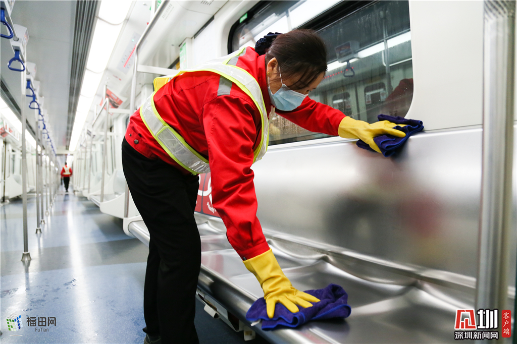 张军香用刚刚兑好84消毒液,细心地为奔跑一天的列车消杀除菌。这段时间的23点-次日的7点,早上从这个区域车间驶出的第一批次列车就是保洁员张军香所在团队消杀清洁过的。16瓶高浓度的84消毒液,勾兑出近600斤消毒水,6个人分三组,140米的车厢,这段时间的每个夜晚,在这座城市最重要的交通工具上默默耕耘。