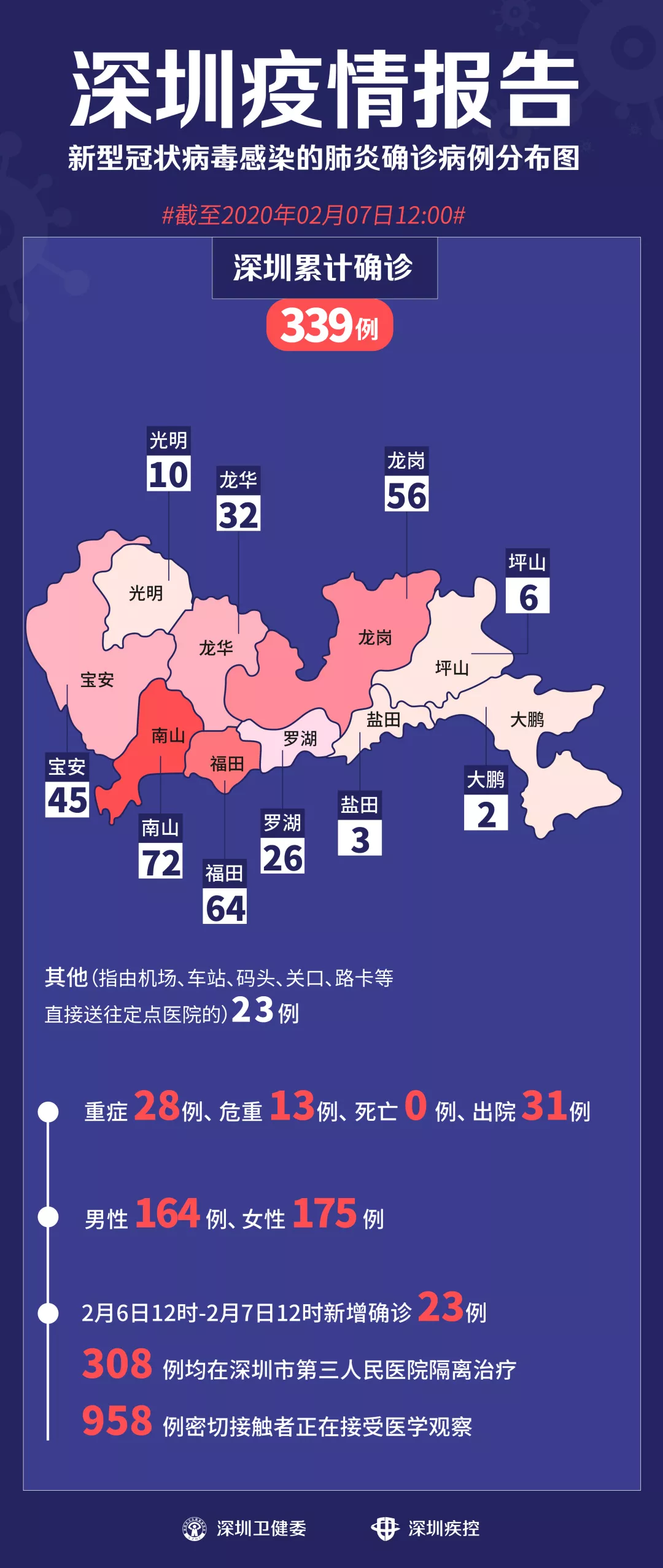 2月6日12时-2月7日12时,深圳新增新型冠状病毒感染的肺炎确诊病例23例。