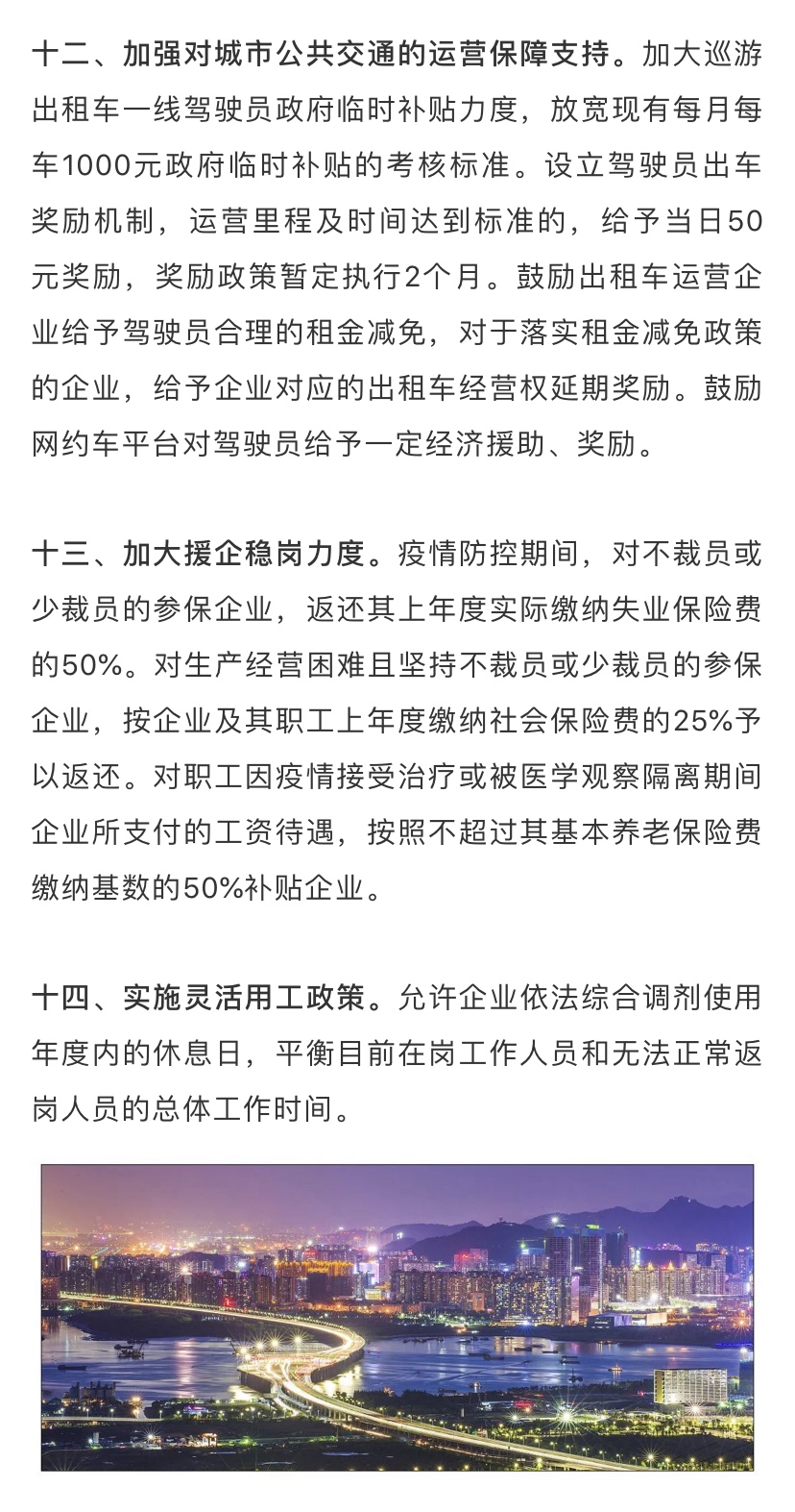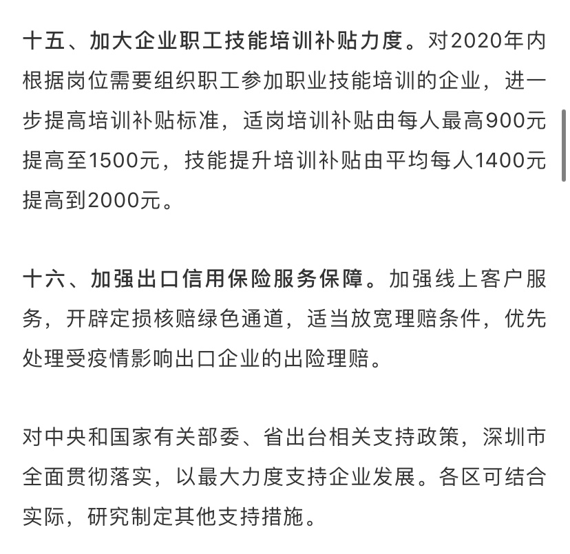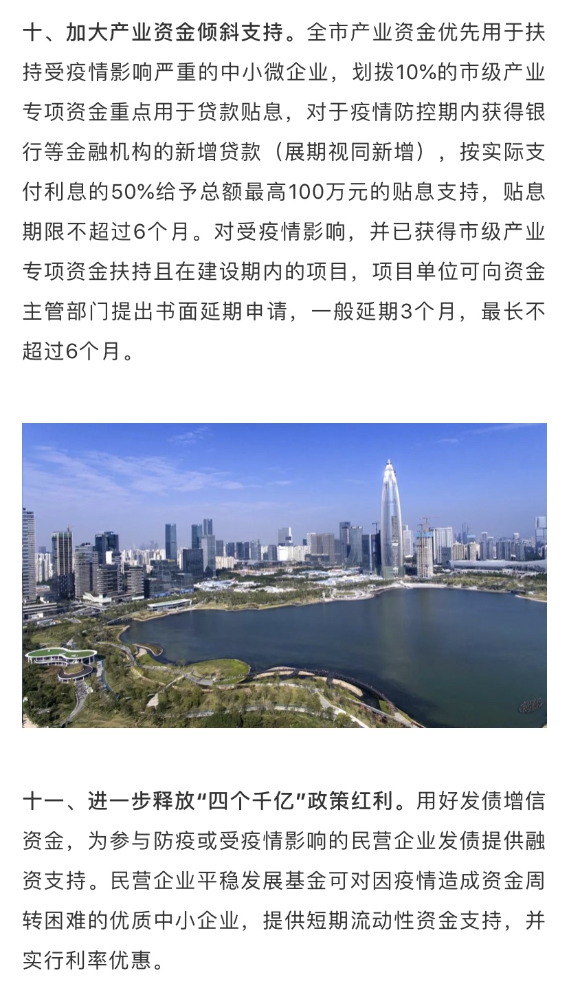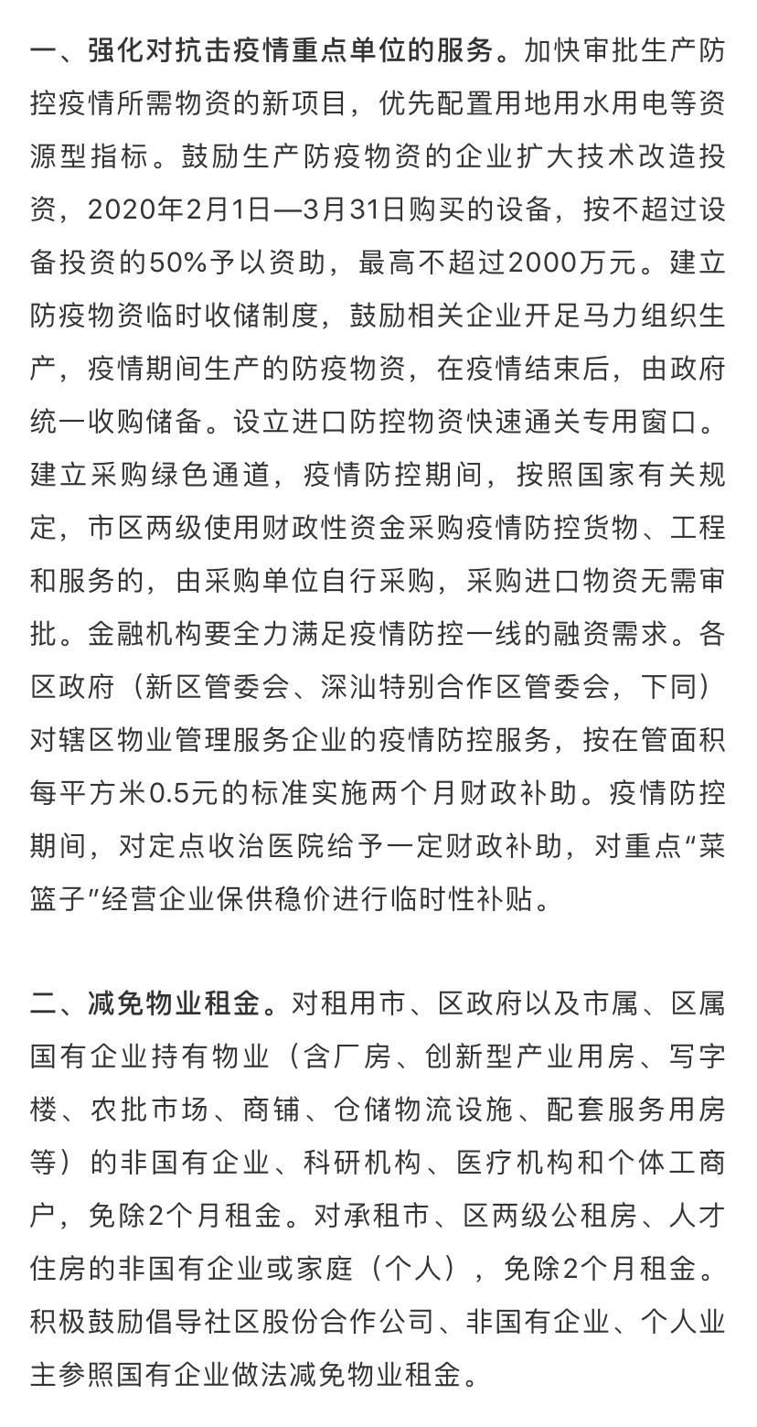 据了解,为深入贯彻落实习近平总书记关于坚决打赢疫情防控阻击战的重要指示精神,全面落实党中央国务院和省委省政府关于做好新型冠状病毒感染的肺炎疫情防控工作的决策部署,在做好防控工作的同时统筹抓好改革发展稳定各项工作,支持企业共渡难关,保障城市平稳运行和经济稳定增长,深圳市政府特制定该工作措施。