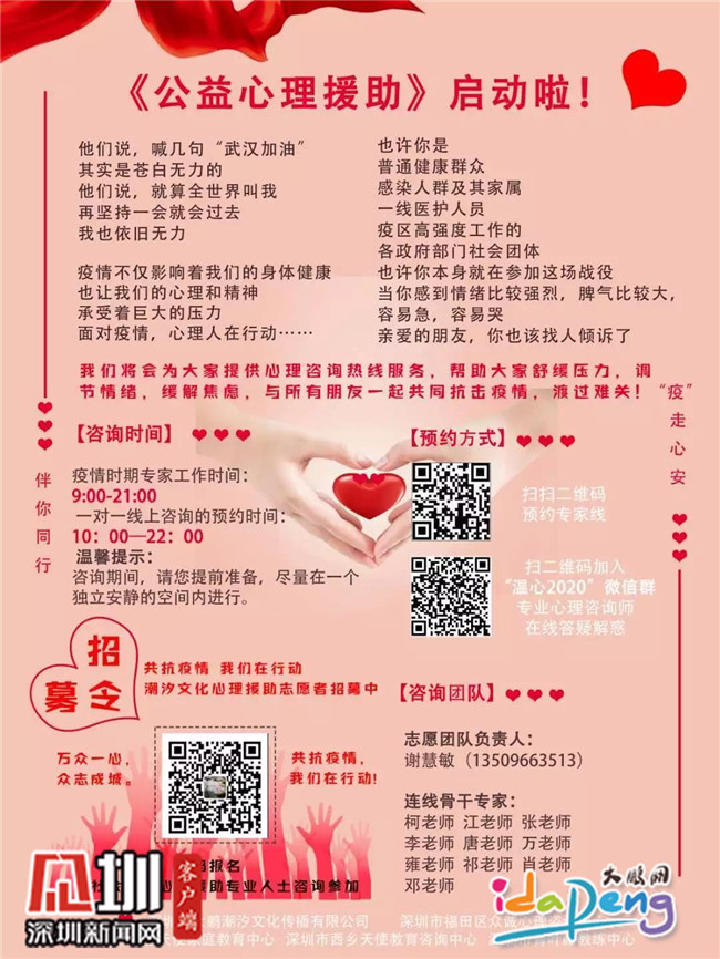 葵涌办事处坝光社区妇联副主席、大鹏潮汐文化传播有限公司负责人谢慧敏积极响应新区群团工作部建立新区防疫心理疏导志愿服务队的号召,联合多家机构启动公益心理援助,为市民提供线上调节情绪、舒缓压力等免费心理服务,共渡心理关,服务将持续到疫情结束。