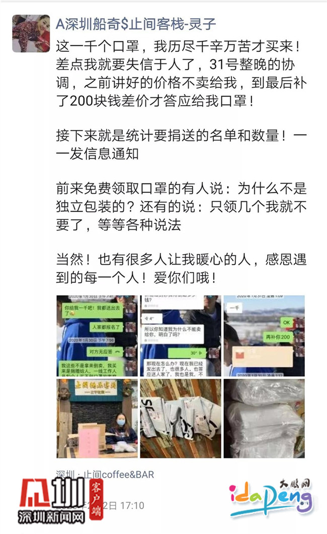 口罩作为最重要的防护物资之一,在这场疫情防控战打响后需求量迅速增加,市面上的口罩供不应求。大鹏新区女性创客示范民宿止间客栈老板黄灵芝在这样的困局中仍想出份力,于是辗转联系上了在尼泊尔的朋友,从1月29日到31日,连续3天反复沟通协调,终于买到了1000个口罩,免费赠送给市民以解燃眉之急。过程千辛万苦,结果暖人暖心,她在朋友圈写到:感恩遇到的每一个人。