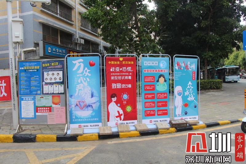 福田梅山苑小区门口陈列着关于疫情防控的告示。