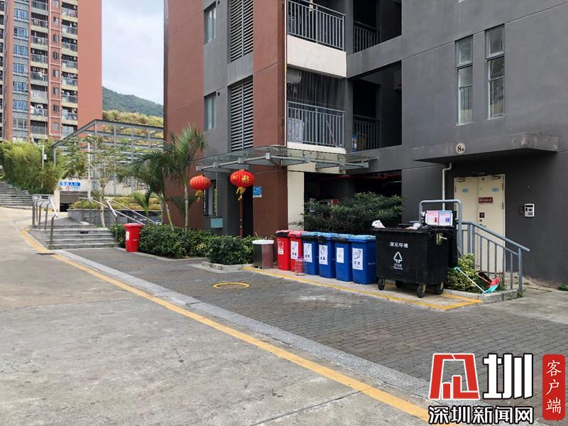 罗湖莲馨家园小区的废弃口罩回收桶与其他分类的垃圾回收桶分开摆放。