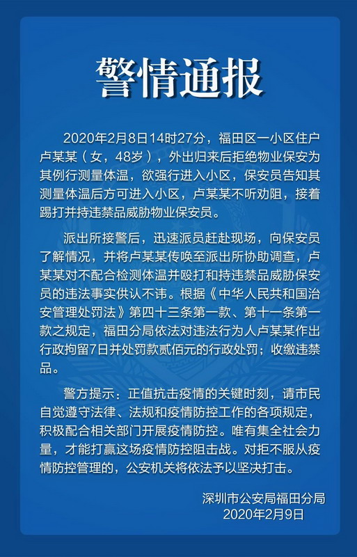 见圳客户端·深圳新闻网2020年2月9日讯 2020年2月8日14时27分,福田区一小区住户卢某某(女,48岁),外出归来后拒绝物业保安为其例行测量体温,欲强行进入小区,保安员告知其测量体温后方可进入小区,卢某某不听劝阻,接着踢打并持违禁品威胁物业保安员。