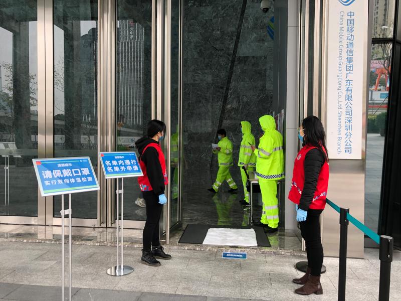 中国移动门口实行双向体温监测,名单内通行,名单外申请。