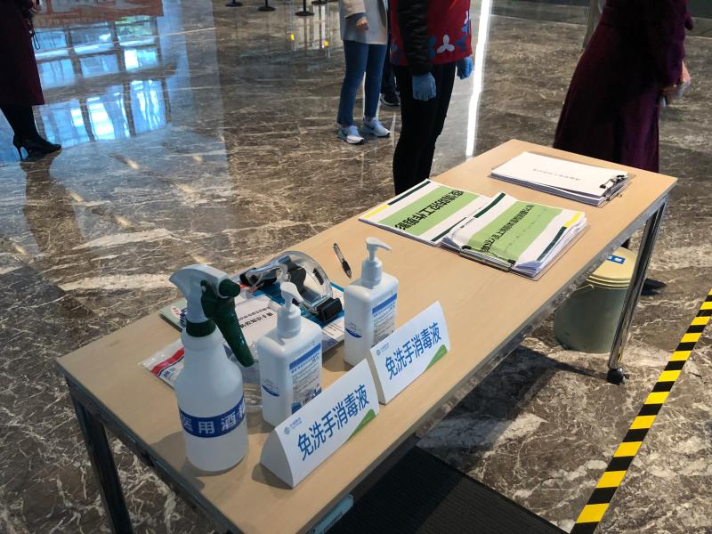 大堂门口放有免洗手消毒液、酒精等,进出人员需要进行登记。