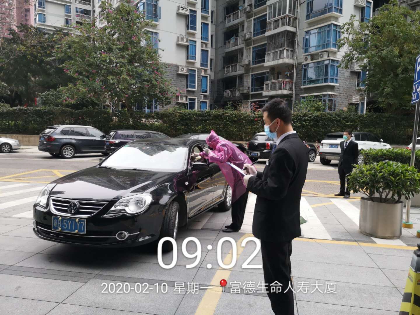 莲花街道富德生命人寿大厦对进入园区车辆驾驶员及乘客进行体温监测及信息登记