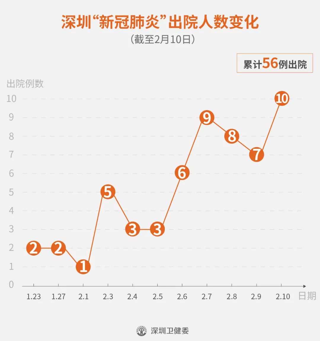 2月10日下午,经专家组会诊,深圳再有10名新型冠状病毒肺炎确诊患者出院,累计的出院者达56人。